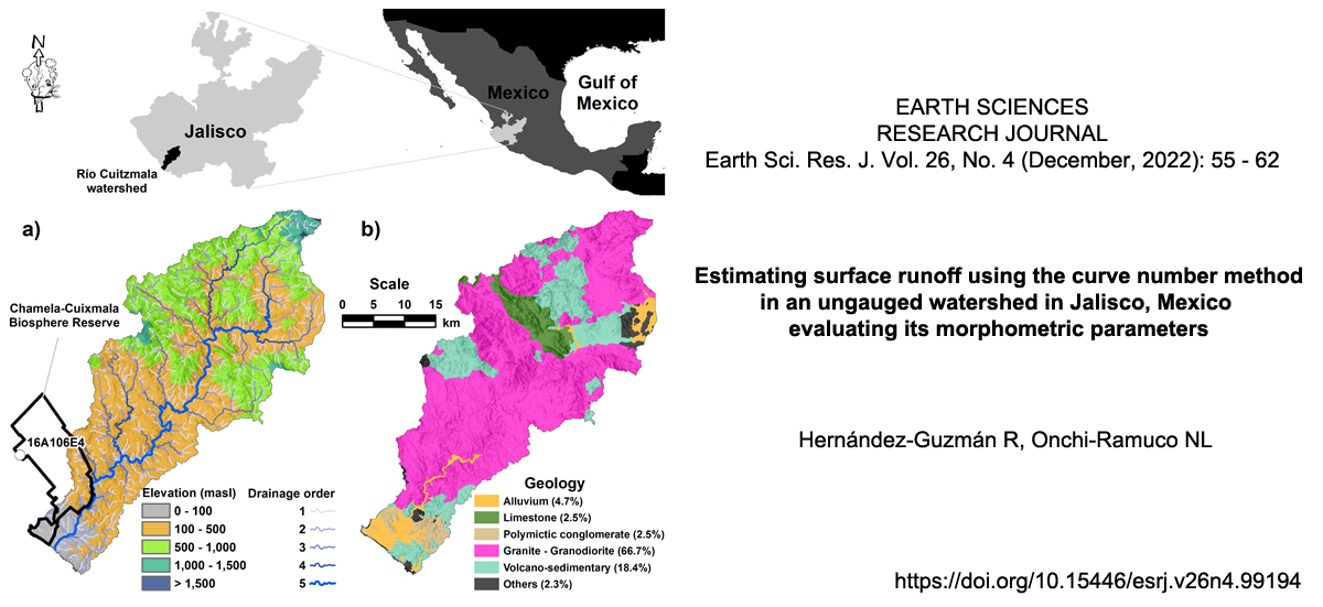 The surface runoff was estimated using the curve number (CN) method for different storm events and it was associated with the morphometric parameters of an ungauged watershed in Jalisco, México. The land use and land cover map from 2019 was derived from the unsupervised classification of a Sentinel-2 image at 10 m resolution. The morphometric analysis revealed that the study area is dominated by areas of gentle slope and moderate to high permeability with dense vegetation and low relief. It is a well-drained watershed with low flood potentiality as well as a groundwater potential zone. About 69% of the study area corresponds to natural cover with tropical dry forest and evergreen forest as the most representative classes. A total of 77 storm events were identified from 2013 to 2019, with runoffs that ranged from 0.05 to 227.2 Mm3. September and October were the months with the most intense rainfall and, therefore, the months with the highest runoff volume. The average runoff was 14.52 Mm3, corresponding to an average runoff coefficient of 12.86%. Together, the methods used here provide useful results for delineating conservation strategies at the watershed level.
